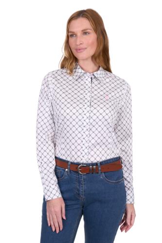 Thomas Cook original hand drawn print, stretch for comfort and movement, contrast spot facings under collar, inside collar stand and under placket, grosgrain taping on inside neck, under placket and sleeve cuffs, criss cross embroidery on cuff pintucks, horseman embroidery on chest