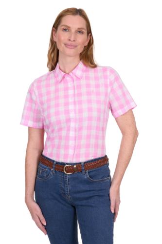 Lightweight cotton yarn dyed check, linen look fabric, contrast facings under collar, inside collar stand, inside yoke and under placket, grosgrain taping on inside neck and under placket, soft gathers on back yoke, horseman embroidery on chest