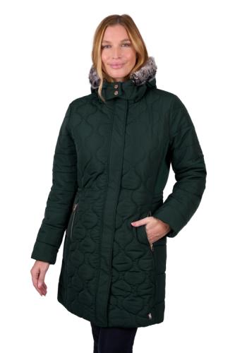 Water repellent textured fabric, unique quilted front, back and sleeves, rust proof metal accessories, premium quality zip closures, detachable hood with detachable faux fur trim, front zip pockets, storm flap, quilted waist shaping to flatter the figure, TC internal trims and pockets, Thomas Cook script embroidery on sleeve hem, horseman embroidery on side hem