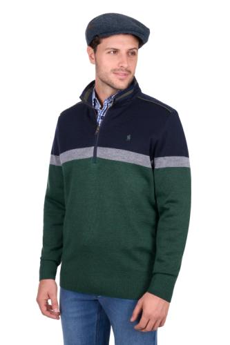 Midweight wool blend rugby knit, Australian merino wool blend, engineered stripe, mock suede detail on collar, front opening, and shoulder panels, rib collar, sleeve cuff and hem to keep shape, 1/4 placket with premium quality metal zip closure, horseman embroidery on chest