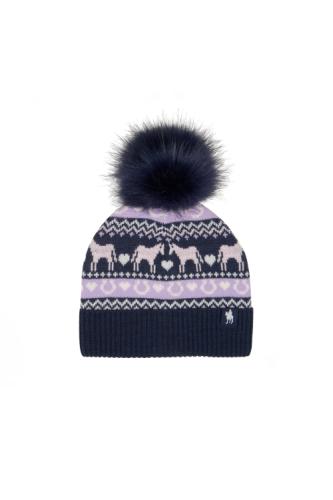 Knitted horse pattern, faux fur pom-pom, polar fleece lining, wool blend for warmth