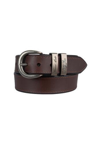 Metal buckle, embossed logo twin keepers, 38mm (1 1/2”) strap width, antique silver hardware. XS(29”), S(32”), M(35”), L(38”), XL(41”), XXL(44”), 3XL(47”), 4XL(50”)