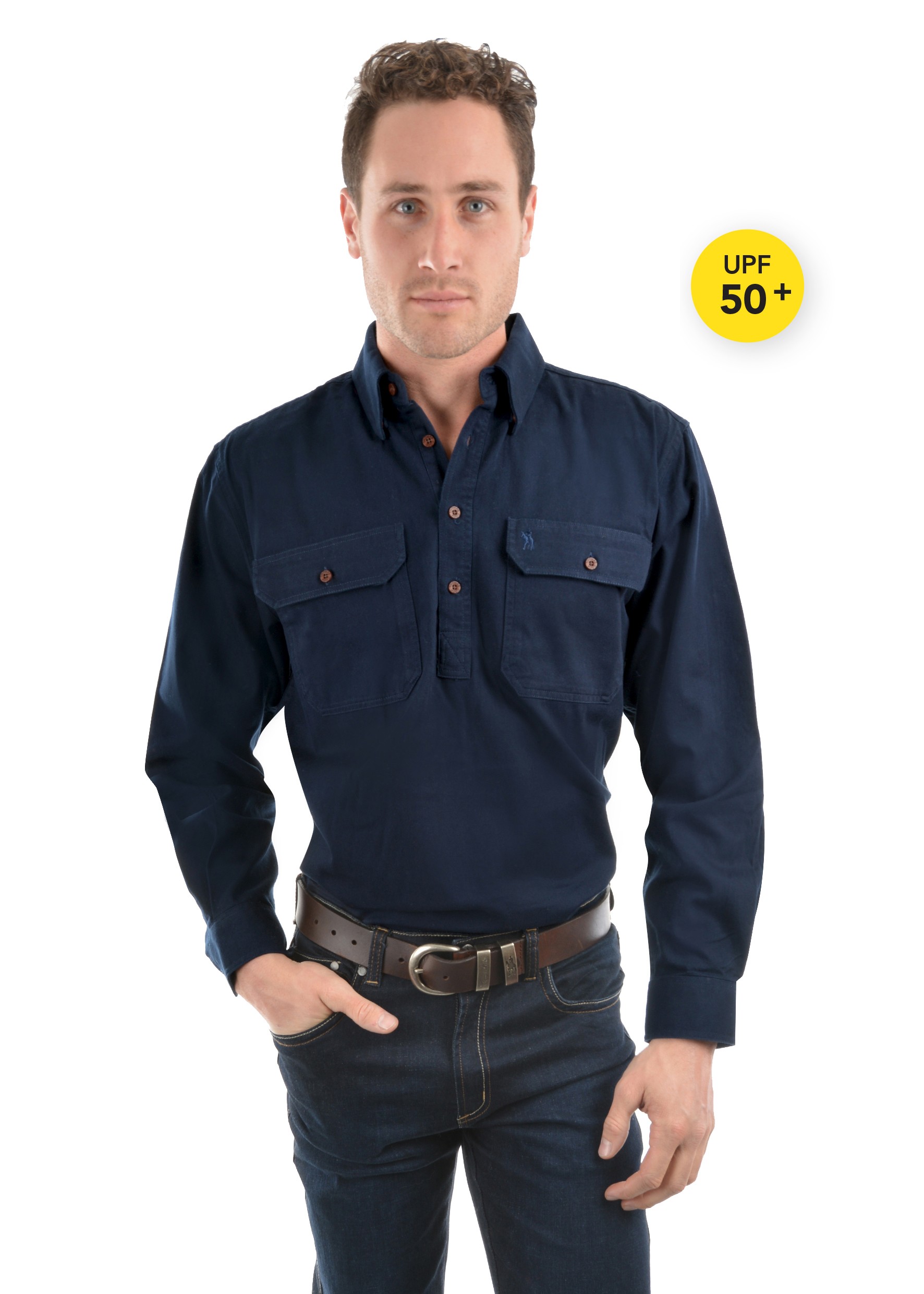Features: UPF Protection Tested And Approved, Durable Heavy Weight Fabric, Classic Work Style, Half Placket For Safety, 2 Countryman Pockets, Concealed Button Down Collar, Logo Buttons